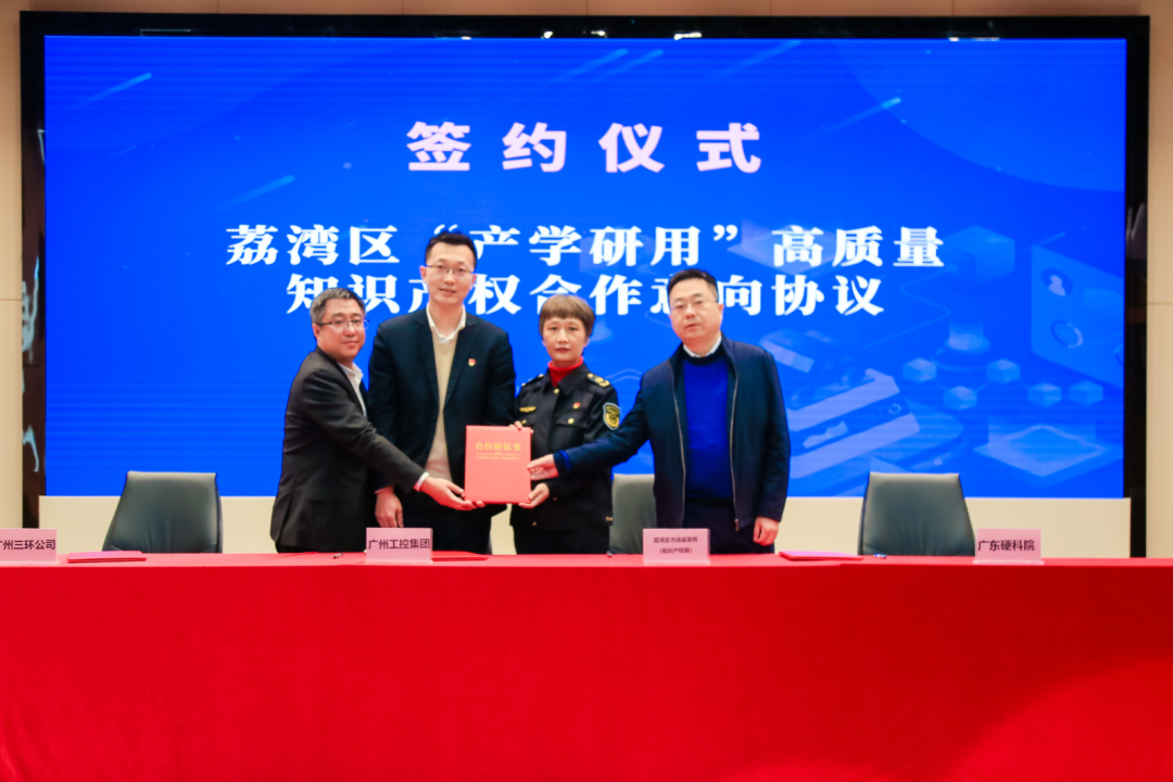 在本次活動(dòng)中,三環(huán)與荔灣區(qū)市場(chǎng)監(jiān)督管理局、廣州工業(yè)投資控股集團(tuán)有限公司、廣東粵港澳大灣區(qū)硬科技創(chuàng)新研究院(以下簡(jiǎn)稱“廣東硬科院”)共同簽訂了《荔灣區(qū)“產(chǎn)學(xué)研用”高質(zhì)量知識(shí)產(chǎn)權(quán)合作意向協(xié)議書》,該協(xié)議以搭建荔灣區(qū)“產(chǎn)學(xué)研用”知識(shí)產(chǎn)權(quán)創(chuàng)造轉(zhuǎn)化平臺(tái)為目標(biāo),旨在探索政府、高等院校、科研院所、企業(yè)、知識(shí)產(chǎn)權(quán)服務(wù)機(jī)構(gòu)在知識(shí)產(chǎn)權(quán)工作中的共贏模式,并確立四方在今后荔灣知識(shí)產(chǎn)權(quán)高質(zhì)量發(fā)展工作中的合作意向。