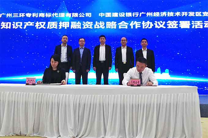 會上,在廣州市知識產(chǎn)權(quán)局協(xié)調(diào)合作處調(diào)研員柯杰兵、廣州開發(fā)區(qū)知識產(chǎn)權(quán)局局長劉石、三環(huán)總經(jīng)理郝傳鑫等相關(guān)嘉賓的見證下,三環(huán)副總經(jīng)理申屠嘉毅、中國建設(shè)銀行廣州經(jīng)濟技術(shù)開發(fā)區(qū)支行副行長周穎梅分別代表雙方簽訂了知識產(chǎn)權(quán)質(zhì)押融資戰(zhàn)略合作協(xié)議。